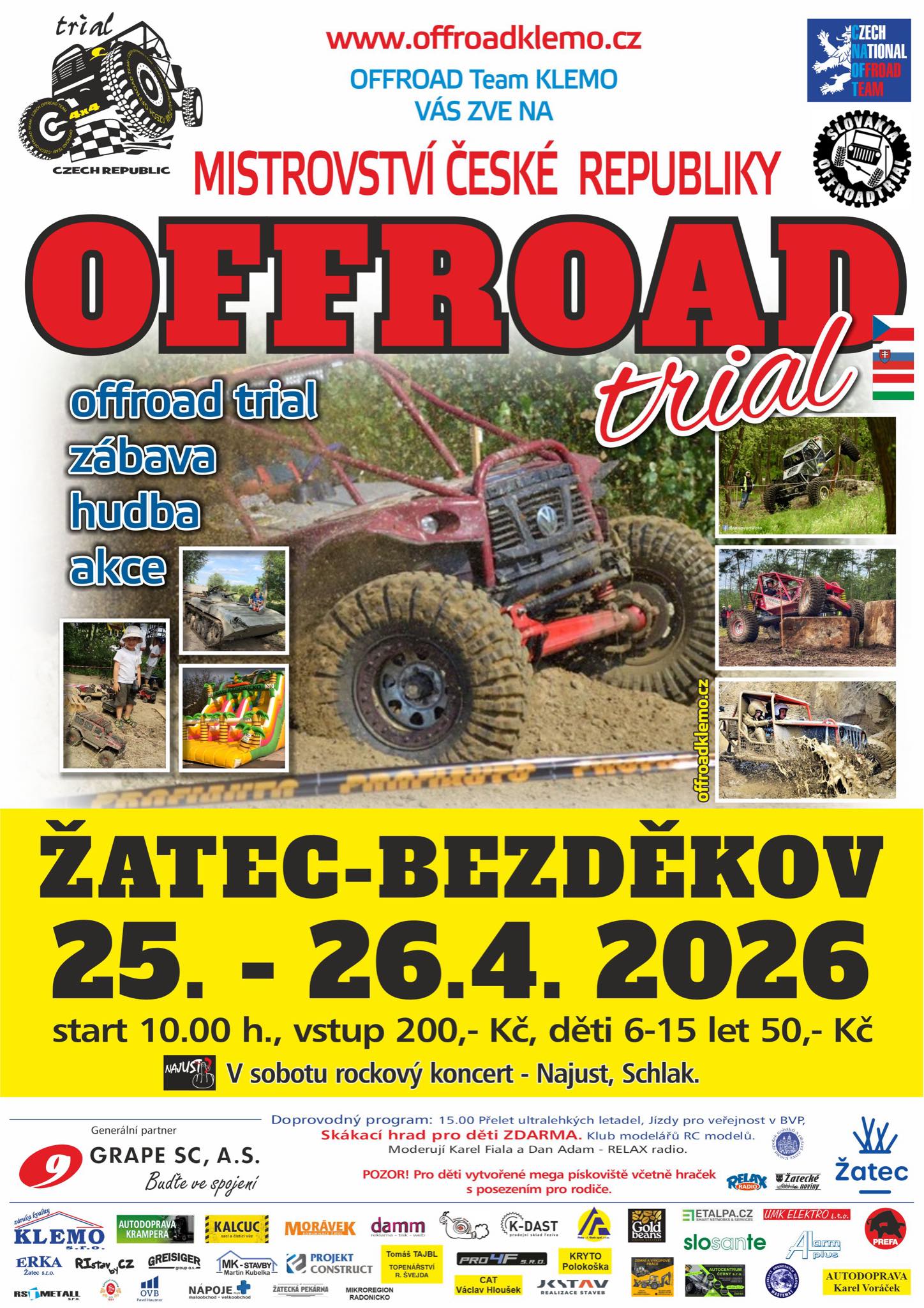 OFROAD TRIAL BEZDĚKOV U ŽATCE - Adrenalinová trialová soutěž Offroad aut v těžkém terénu. Sobota a neděle 25. -26. Dubna. Koncerty NAJUST A SCHLACK. Mega pískoviště. Jízdy BVP a další doprovodný program.
