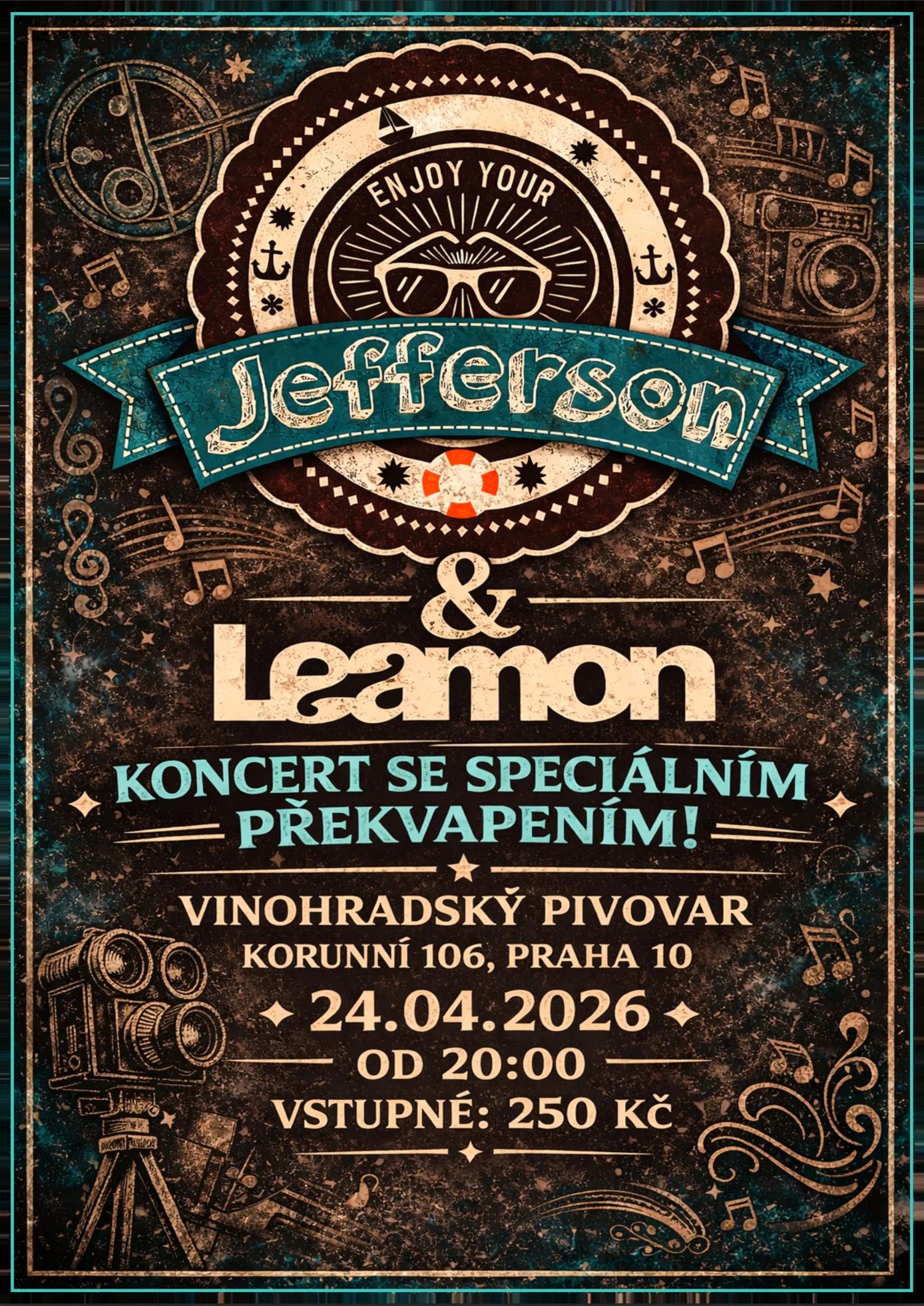 Zveme všechny na koncert poprockových kapel Leamon a Jefferson, který se uskuteční 24.4.2026 od 20 hodin ve Vinohradském pivovaru! Bude to večer plný energie, hudby a bude taky jedno velký překvapení! Tak si ho nenechte ujít a doražte! Lístky za lepší cenu koupíte už teď na: https://www.smsticket.cz/vstupenky/69286-leamon-jefferson-prekvapeni-vinohradsky-pivovar-praha#similar