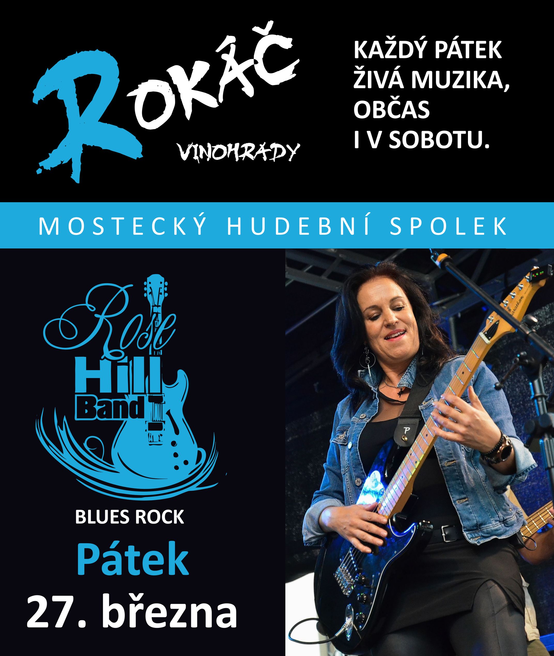V mosteckém Rokáči Vinohrady v pátek 27. března vystoupí blues-rocková formace ROSE HILL BAND. Luboš Hnát - bicí. Hudebník hrající v orchestru Vinohradského divadla, v kapelách Bluesberry, Babalet, Sign of 4, Labyrint a dalších. Václav Šavr - kytary, Radek Vaněk- basa. Daniela Pacovská je více známá z jazzové scény. Prošla spoustou různých hudebních stylů, aby našla své místo u bluesrocku.