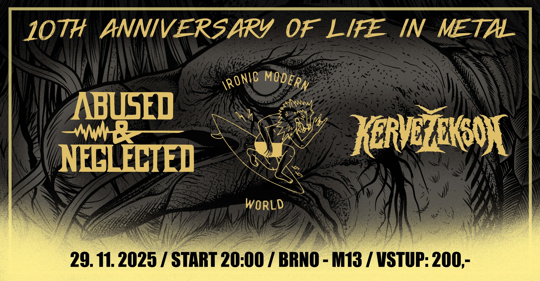 Abused & Neglected míří do Brna! V sobotu 29. 11. 2025 od 20:00 v klubu M13 oslaví svou první dekádu pořádnou dávkou metalu a speciálním setlistem! Na pódiu je doplní Kervežekson – crossoverová smečka, která vypustí svůj krak’en’roll, a Ironic Modern World ze Slovenska – pure rock’n’rollová kapela, která rozjede pekelnou jízdu! Buď u toho, když se bude slavit poctivý rock’n’metal!