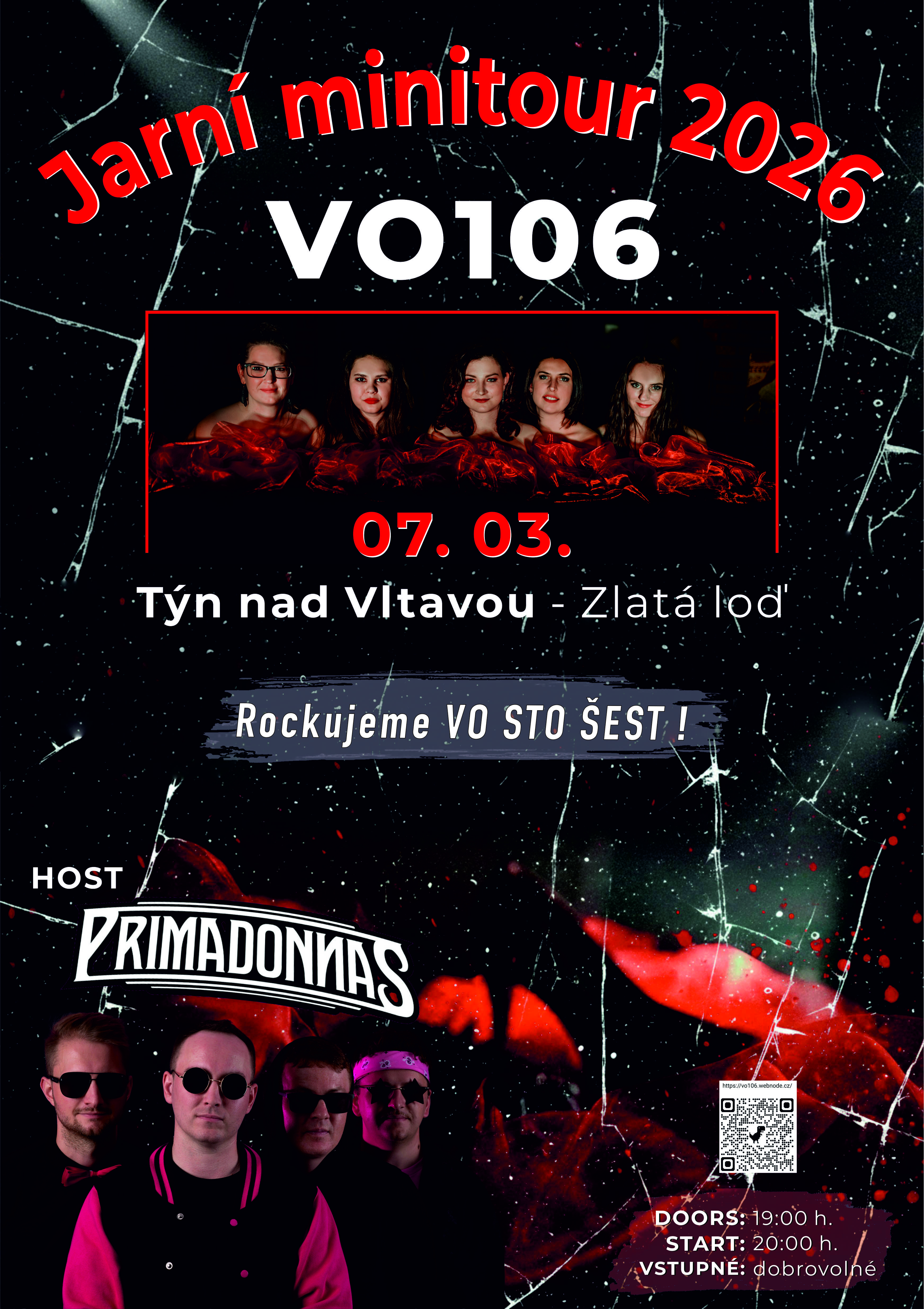 Koncert dámské kapely VO106 a kapely Primadonnas v Týně nad Vltavou ve Zlaté lodi v rámci společné jarní minitour. Začátek akce ve 20 hodin, vstup je dobrovolný. Těšíme se na Vás!