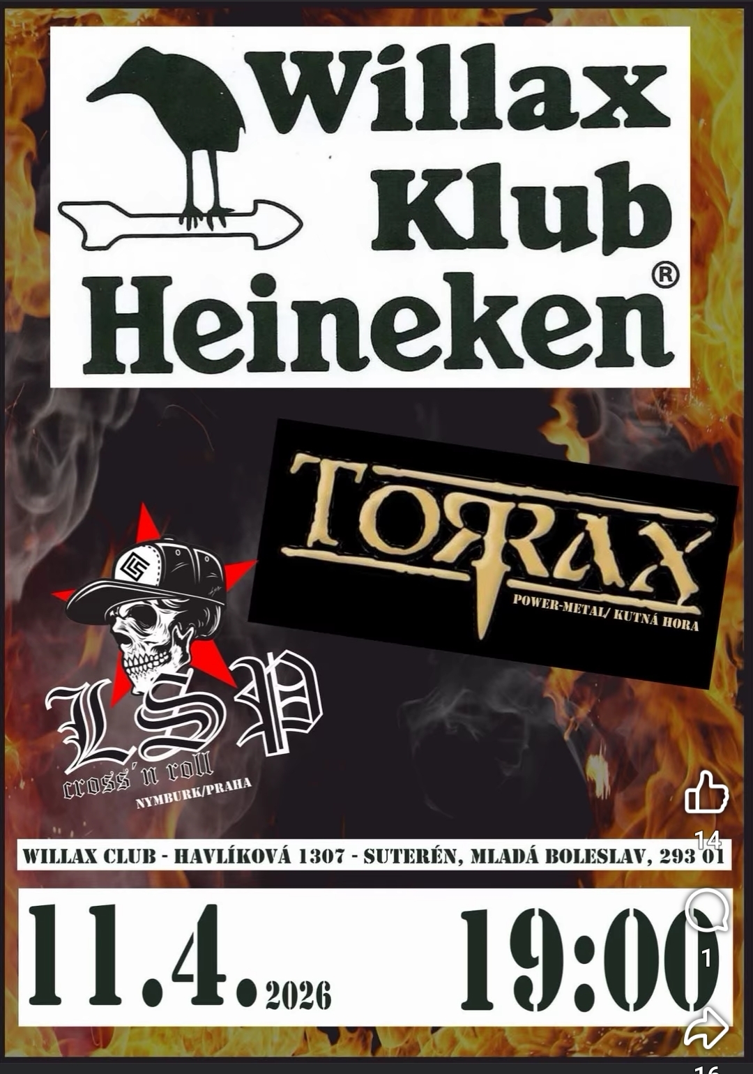 Zdravím všechny příznivce dobrého metalu a chtěl bych Vás pozvat na koncert kapel LSP a TORAX ve WILLAX klubu Mladá Boleslav, který se bude konat již tuto sobotu 11.4.2026 . Open klubu je v 19:30Těšíme se na vás.