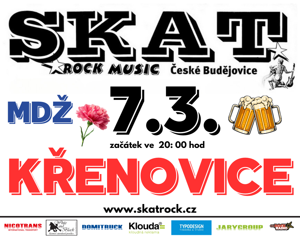 MDŽ - kapela SKAT rock, zahraje v sobotu 7. 3. 2026, od 20:00h v Křenovicích u ČB, na rockové tancovačce k MDŽ
