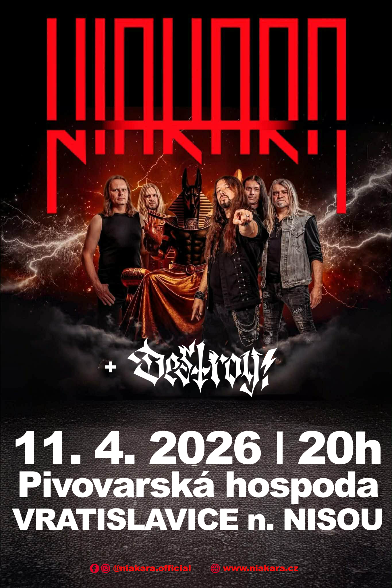 Niakara, česko-slovenská metalová formace vedená Zdeňkem Kubem (ex Arakain), pokračuje v rámci Anubis Tour 2026 koncertem na severu Čech. 11. dubna vystoupí v Pivovarské hospodě Konrad ve Vratislavicích nad Nisou. Těšit se můžete na skladby z aktuálního EP Anubis i léty prověřené songy. Jako speciální host vystoupí mladá crossover-metalová partička Destroy!.