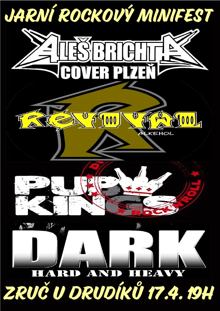 Přátelé, další akce kterou připravujeme na letošní jaro - opět U Drudíků - Zruč - Jarní rockový minifest. V první polovině večera představí vlastní tvorbu kapely DARK a PubKings, no v druhé polovině si zabékáme známé fláky v podání kapel Revival Alkehol a Aleš Brichta Cover.
