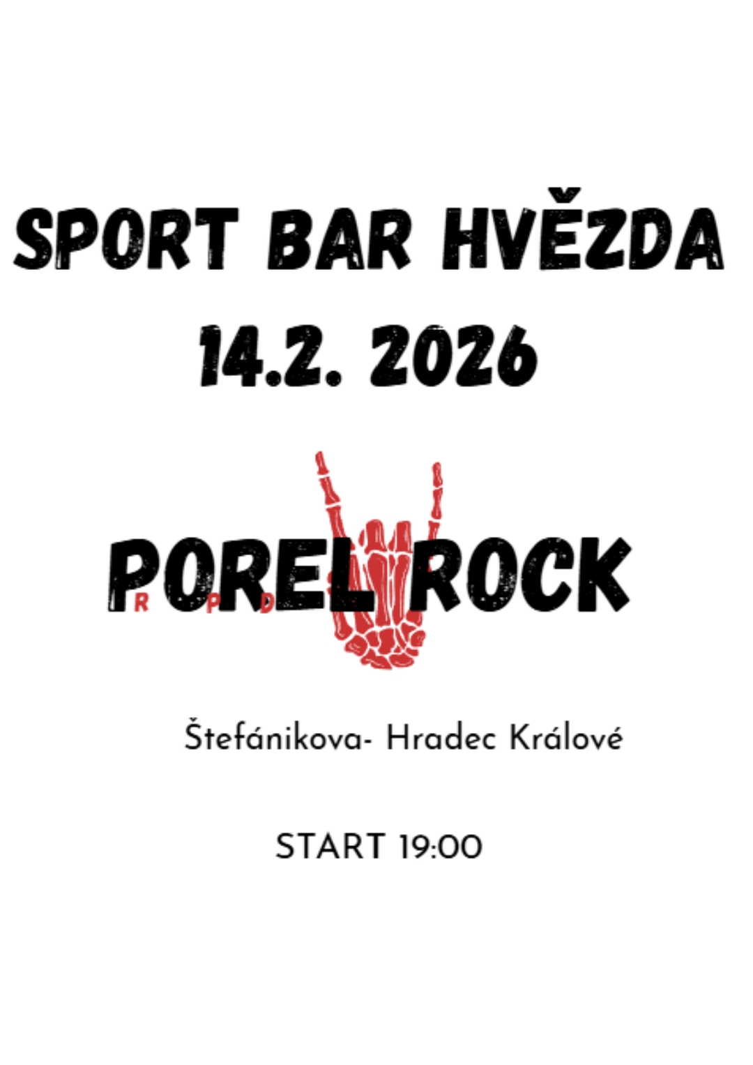 Ahoj. Zveme vás na kapelu PORELROCK v sobotu 14.2.2026 od 19.00 v baru Hvězda v Hradci Králové.
