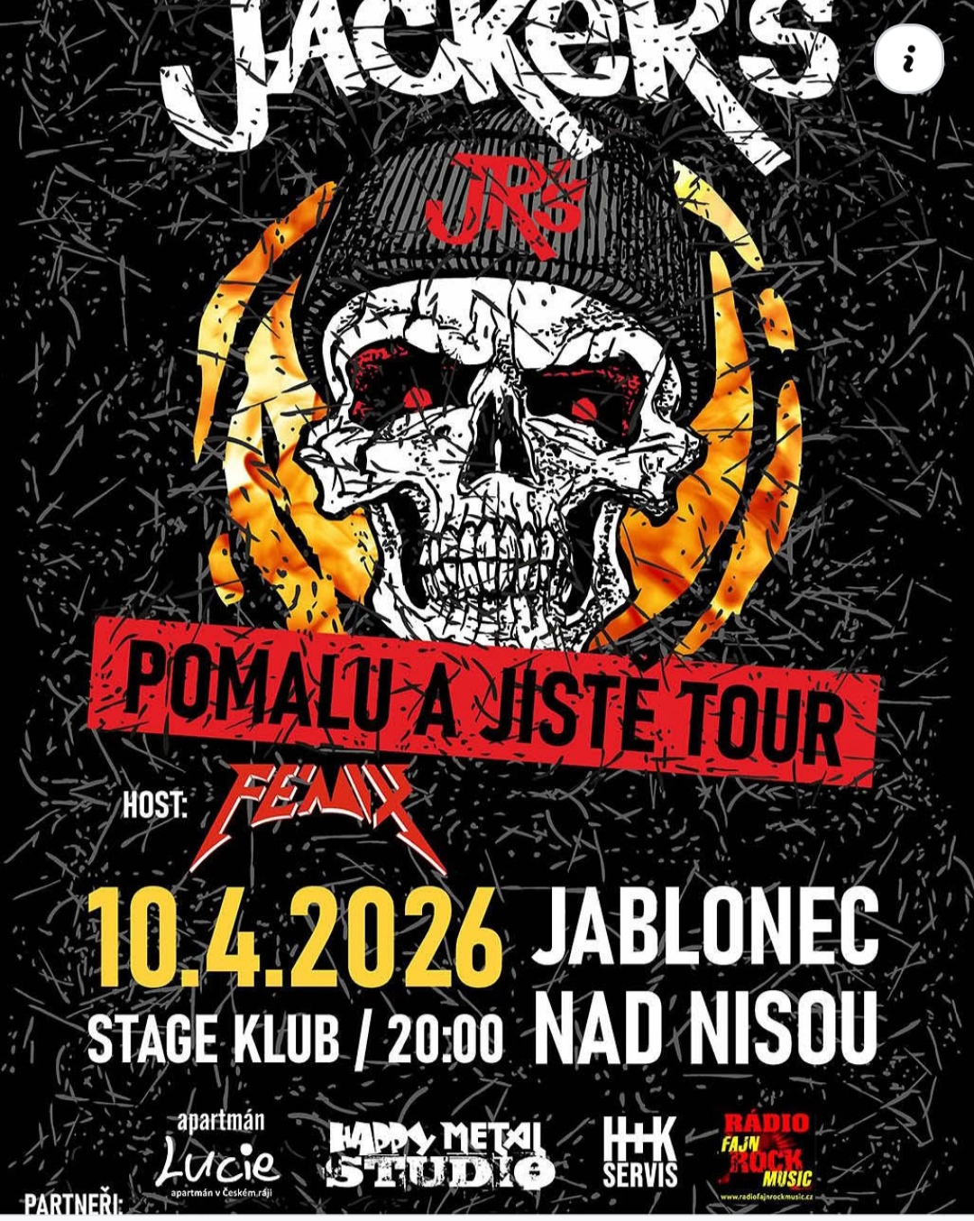 Skupina Jacker's pokračuje ve své Pomalu a jistě tour.Její další zastávkou bude v pátek 10.4. Stage klub v Jablonci nad Nisou.Uslišite staré pecky a i nové skladby , které jste ještě neslyšeli.Večer rozjedou kamarádi z kapely Fenix.Tesime se na Vás.