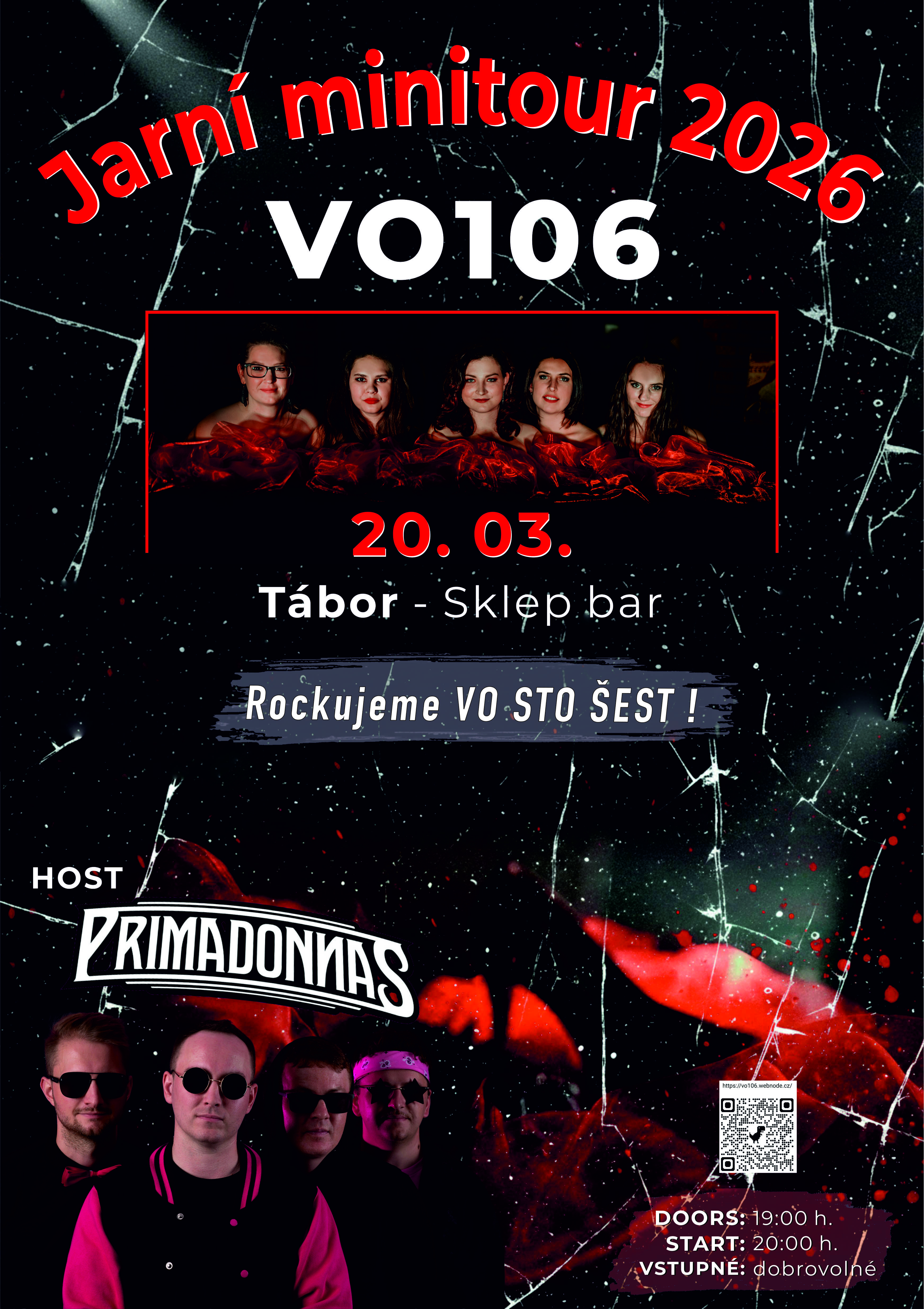 V pátek 20. března se od 20 hodin uskuteční rockový koncert dámské kapely VO106 a kapely Primadonnas v Táboře ve Sklep baru. Jedná se o jednu ze zastávek v rámci společné jarní minitour. Vstupné je dobrovolné. Těšíme se na Vás!