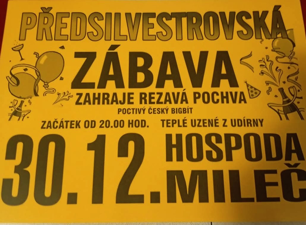Předsilvestrovská palba 30.12.2025. Mileč u Nepomuka, zahraje skupina Rezavá pochva, podávat se bude teplé uzené z udírny. Poctivý český bigbít.