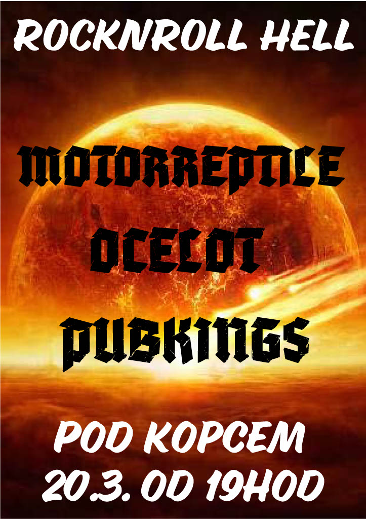 Přátelé, Plzeň, Božkov, Pod Kopcem - večer plný důrazného a řízného RocknRollu!! Zahrají kapely Pubkings, Ocelot a Motorreptile. Přijďte, bude to vostrý a bude to nahlas.