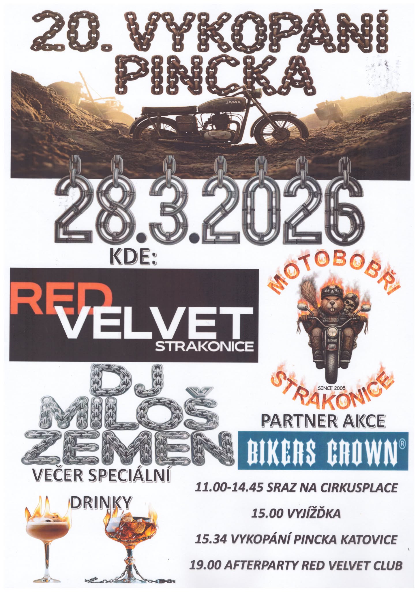 Zveme všechny motorkáře na naše tradiční zahájení motosezóny ve Strakonicích dne 28.března 2026. Sraz motorek, jídlo, pití, muzika, setkání s přáteli, kaskadér, vyjížďka, vykopání pincka z hrobečku, večerní rocková afterpárty s DJ Milošem Zemenem v klubu Red Velvet Strakonice.