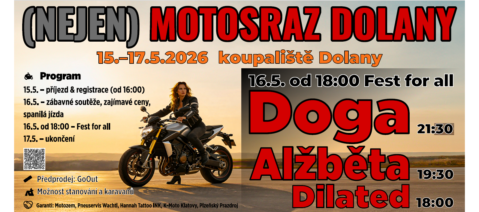 Zveveme všechny milovníky motorek a slušného rocku na Motosraz který se koná od 15.5 - 17.5. v Dolanech u Klatov. Pro účastníky motosrazu je v ceně tahrnuto parkování, stanování. Soutěže o zajímavé ceny, spanilá jízda. V rámci motosrazu proběhne 16.5 od 18 hod. Festival, kde vystoupí kapely Doga, Alžběta, Dilated, kterého je možné se zúčastnit samostatně. Předprodej vstupenek v síti Goout.